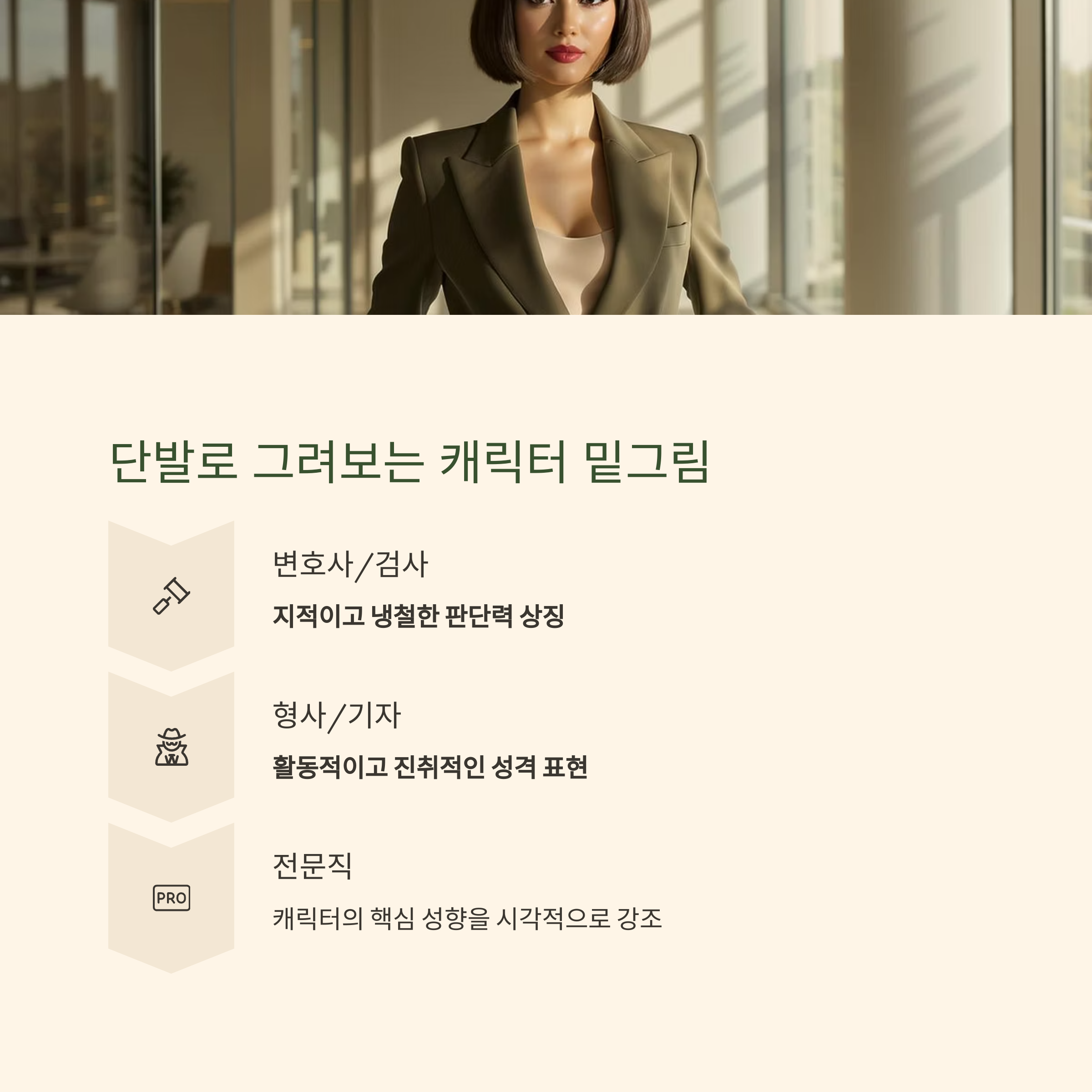 혹은 긴박한 사건 현장을 누비는 형사나 기자라면, 활동적이고 진취적인 성격을 시각적으로 표현하는 데 효과적일 것입니다.