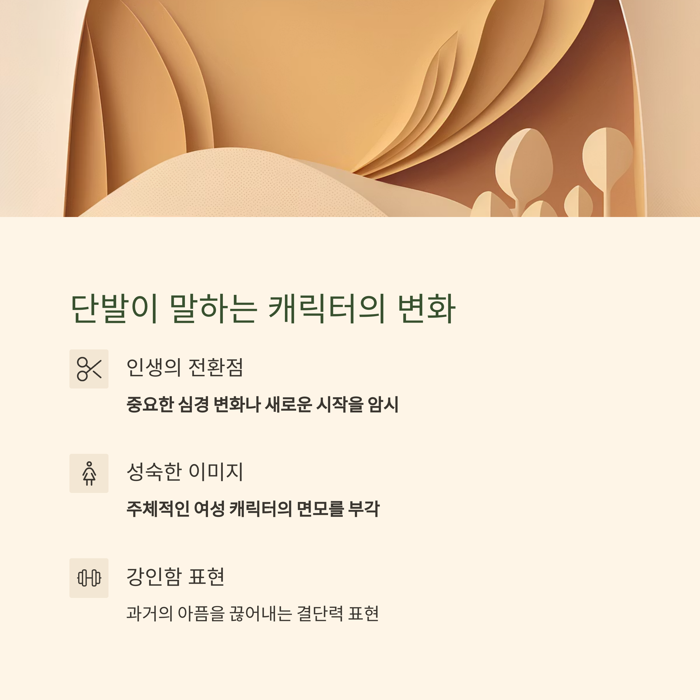 | 과감한 이미지 변신 | 과거와의 단절, 새로운 시작, 강인함 | 내면의 상처를 극복하고 성장하는 캐릭터 |