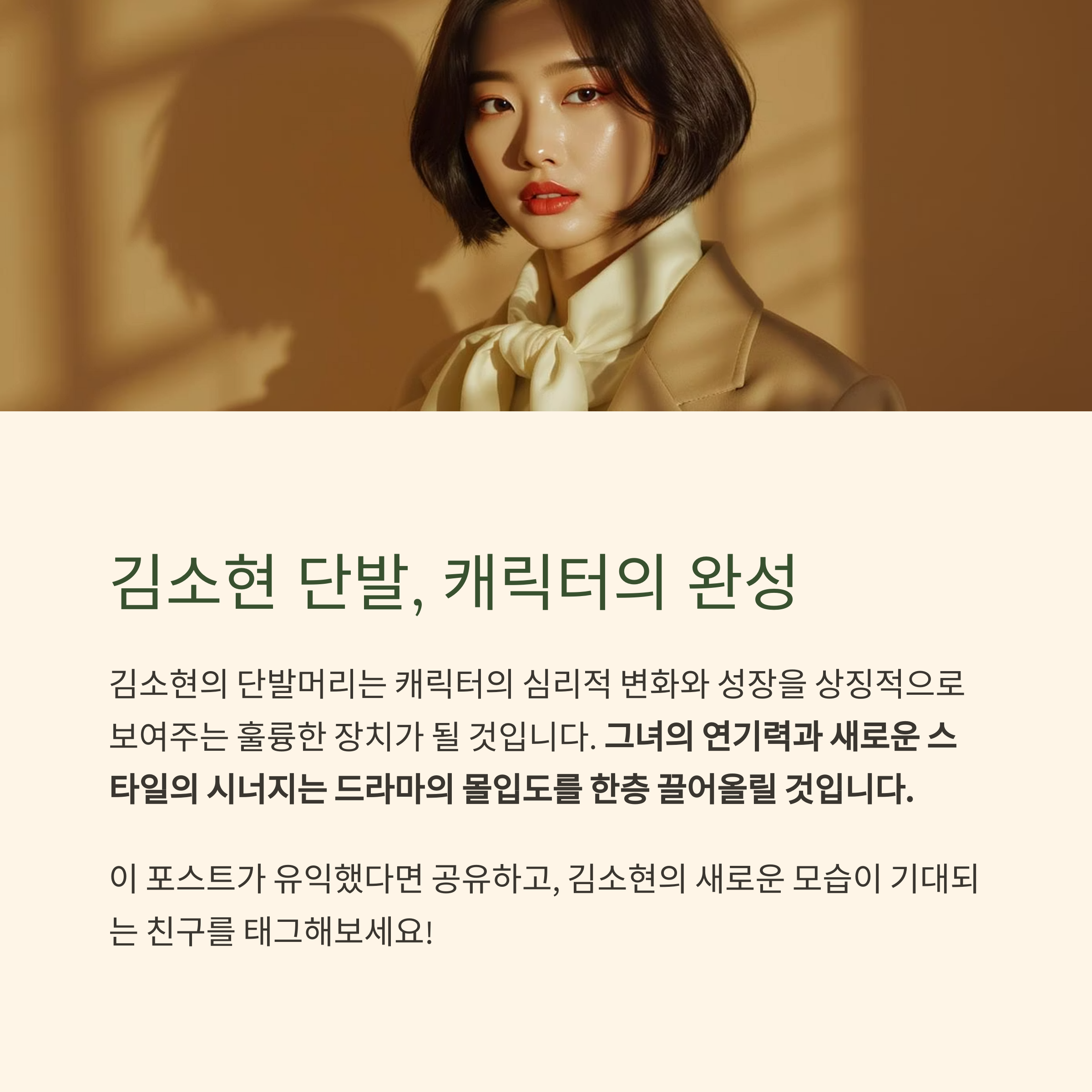 어떤 역할이든 김소현의 단발은 캐릭터의 핵심적인 성향을 뚜렷하게 보여주는 중요한 시각적 장치가 될 것입니다.