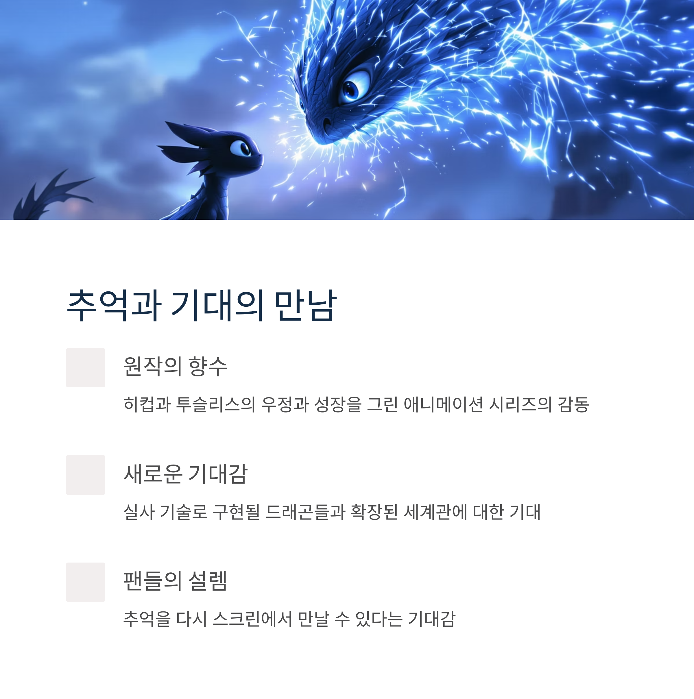 | 스토리 기반 | 크레시다 코웰의 동명 소설 | 원작의 감동적인 서사 유지 및 확장 가능성 |