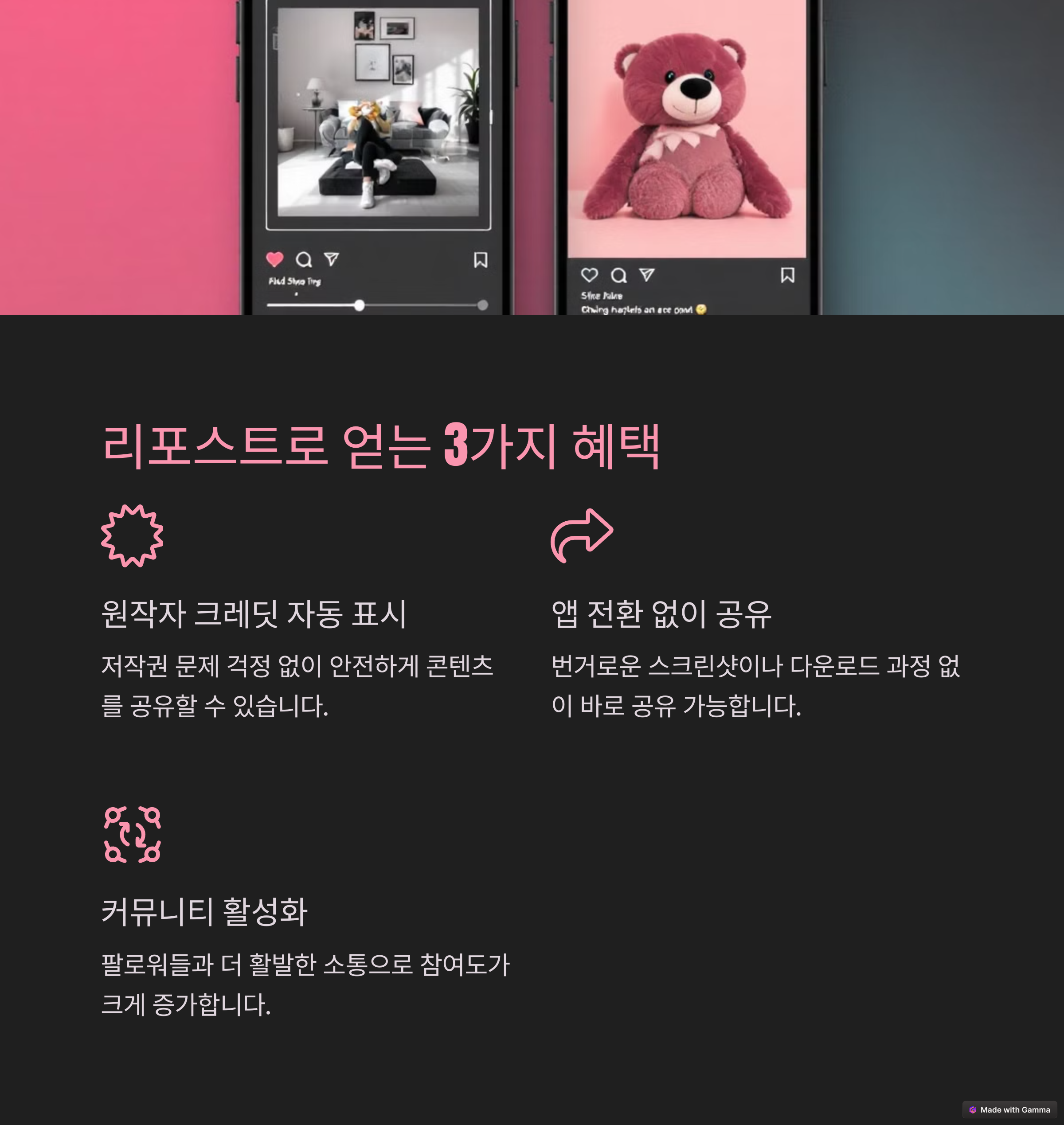 | 리포스트 장점 | 저작권 문제 없이 안전하게 콘텐츠 공유 가능 |