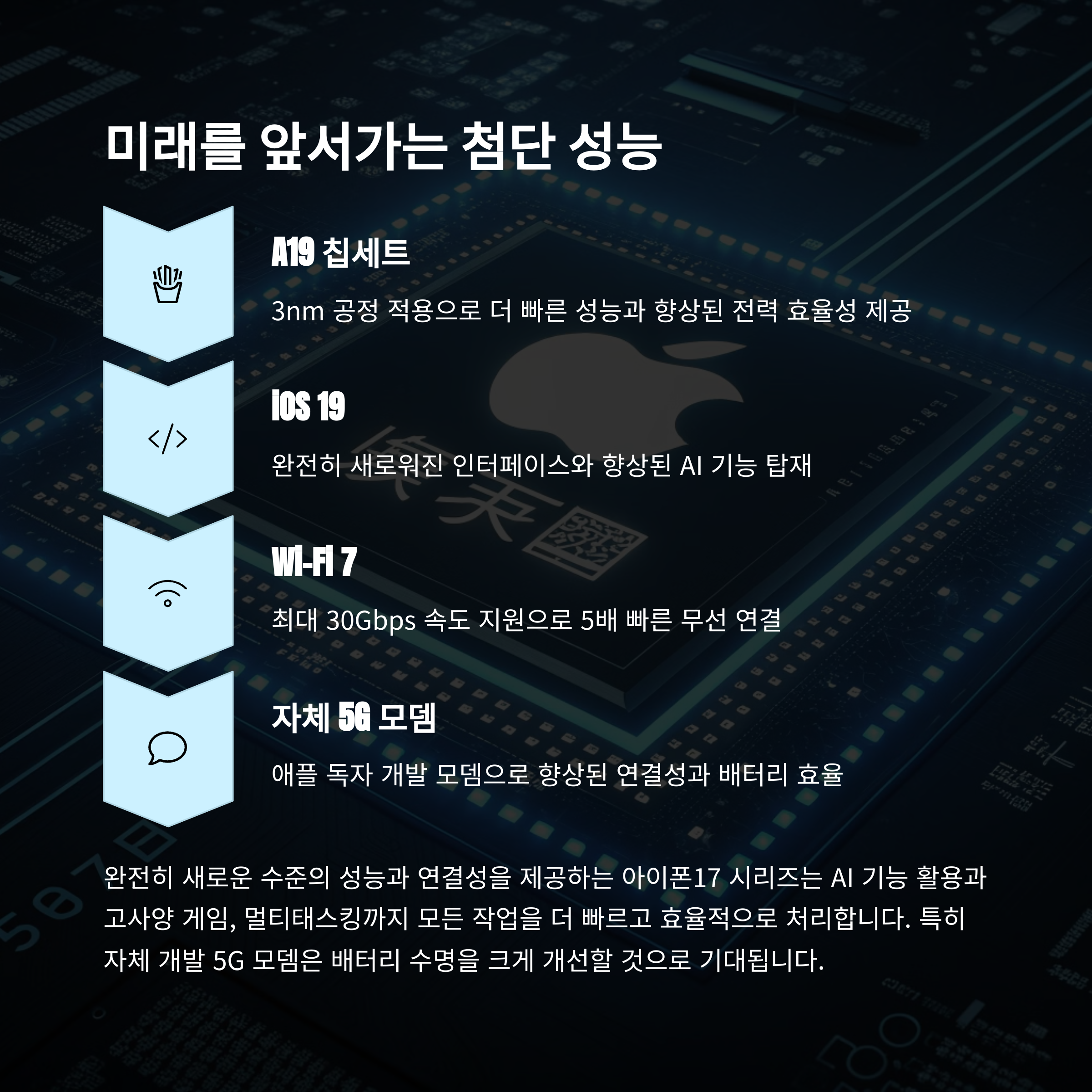 성능 면에서도 대폭 향상이 있을 전망입니다. A19 칩셋은 3nm 공정을 기반으로 하며, 일반 모델은 8GB, Pro 모델은 12GB RAM이 적용될 것으로 보입니다. 또한 iOS 19는 아이콘 및 UI 전반이 새롭게 디자인될 예정이며, Wi-Fi 7과 애플 자체 설계 5G 모뎀까지 탑재되어 네트워크 성능도 개선될 것으로 기대됩니다. 아이폰17의 가격은 기존 아이폰15 시리즈와 유사하게 유지될 전망이며, 발표 직후 금요일부터 예약 판매가 시작될 가능성이 높습니다. 하반기 플래그십 스마트폰 시장에서 또 한 번의 혁신이 예고되고 있습니다.
